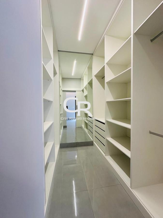 3 Dormitórios, sendo 1 Suíte. A suíte conta com closet planejado (incluindo porta de fechamento e espelho interno panorâmico), painel de gesso do chão ao teto para TV e porta-balcão com acesso ao corredor.